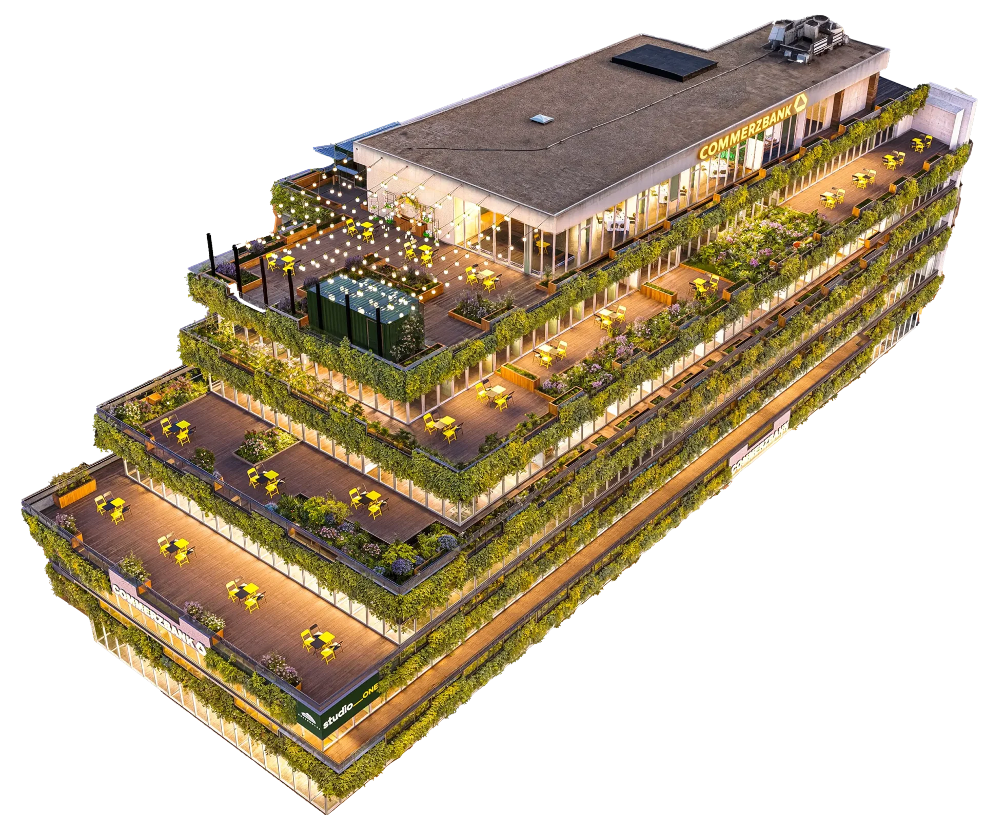 Grüner wird’s! Das Greenhouse am Neumarkt setzt die neue grüne Landmarke Wuppertals mitten im Herzen der Stadt. Die moderne Arbeitsumgebung erwächst durch die innovative und nachhaltige Bauart, welche den ehemals grauen Betonblock zur Lunge der Elberfelder Innenstadt gemacht hat. Hier wird nicht nebeneinander her gearbeitet – hier wachsen Gastronomie, Einzelhandel und Büroalltag zusammen. Umgeben von urbanem Flair und bester Verkehrsanbindung könnte dein Laptop auf einem der grünen Balcony Offices mitten über den Dächern des Neumarkts stehen.